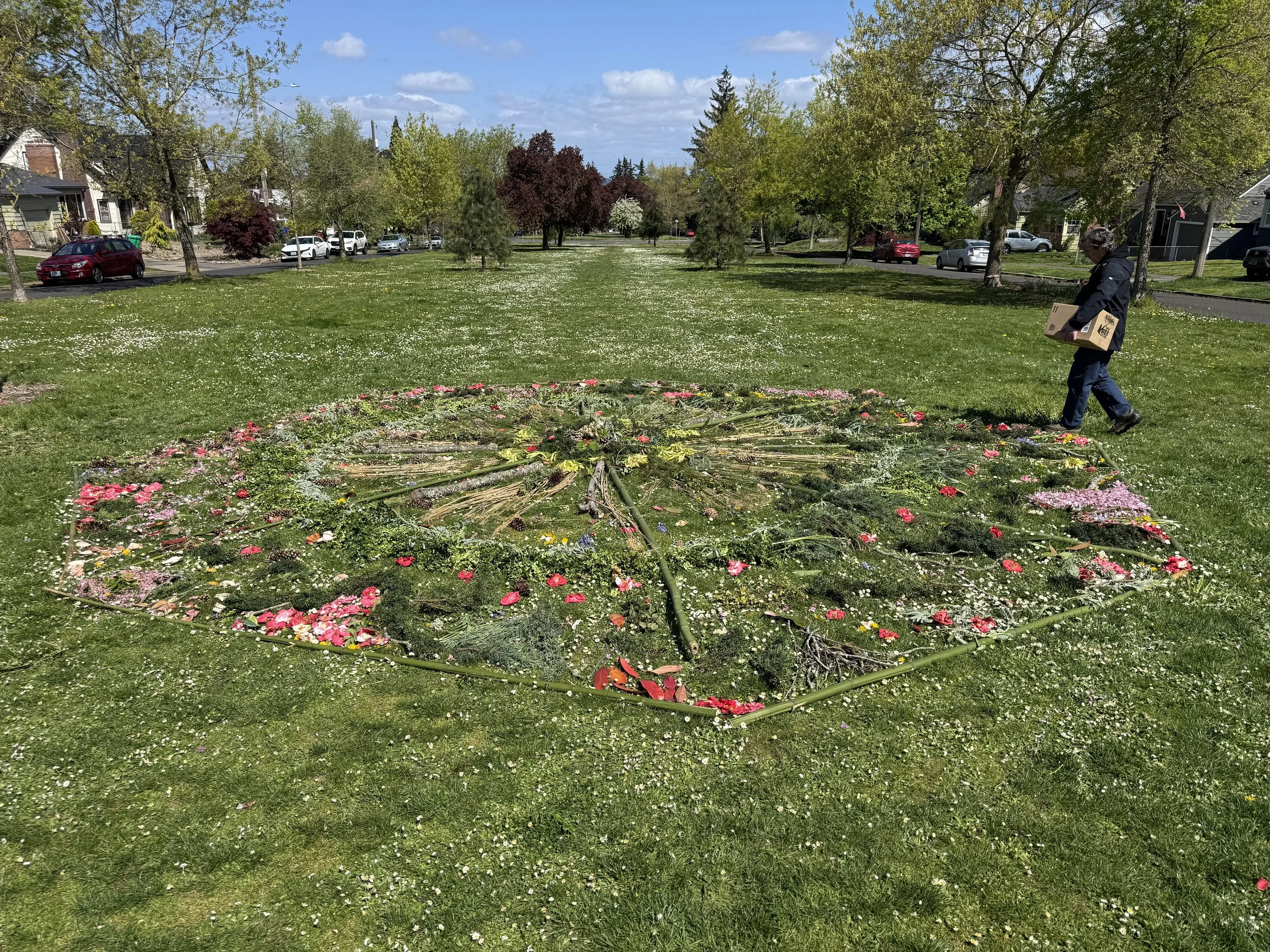 Earth Day is one of Roseway’s community rituals! The neighborhood gathered once again in April this year to salute all things spring, soil and sky. The plaza and parkway were abuzz with native seed starts, pollinator patch chats, salmon hats, face painting, chalk drawings and tabling from our friends at Rose City Bluff Restoration and Rocky Butte Farmers Market. Thanks to donations from Blossom Landscaping and offerings from everyone’s gardens, neighbors worked together to create another beautiful living mandala. A living spontaneous piece of art, the mandala takes a different form every year. This year it smelled like sage harvested from a nearby yard, with piles of pink cherry blossoms sprinkled by kids in the corners.