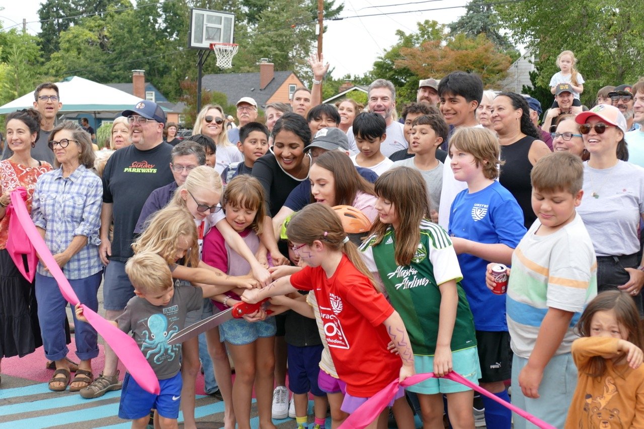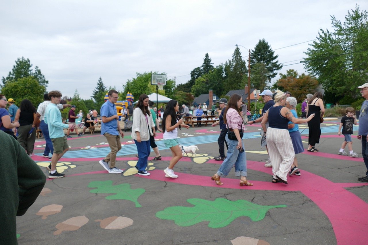 The Roseway Plaza celebration included free food, drink, and entertainment thanks to a Community Grant from SE UPlift. City officials walked and danced around the street mural with neighbors, spoke about their support of community spaces, and helped cut the ribbon that marked the official opening of the plaza to the community.